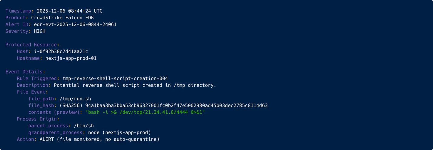 Another critical takeaway is the need to invest in runtime-aware detections and post-exploitation monitoring. The incident only became undeniable once Node spawned a shell, which is far too late in the kill chain.