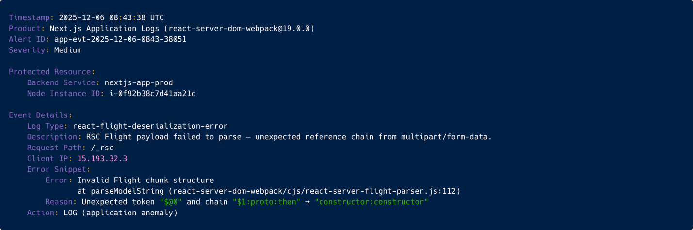 React Server Components rarely produce abnormal promise-like (then) structures from user input. Tier-2 identifies this as a high-signal behavioral indicator that someone is attempting to trigger code paths deep inside the RSC machinery. At this stage, the event is reclassified as an active exploitation attempt, pending host-level evidence.