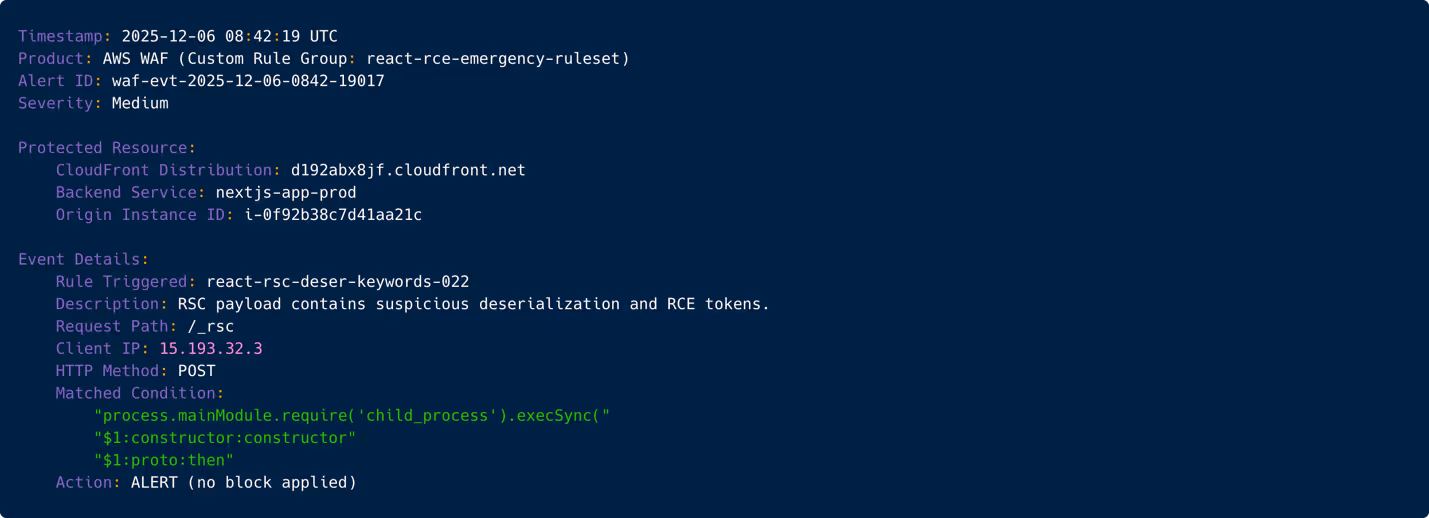 Figure 2: WAF alert showing exploit-related keywords inside the RSC payload