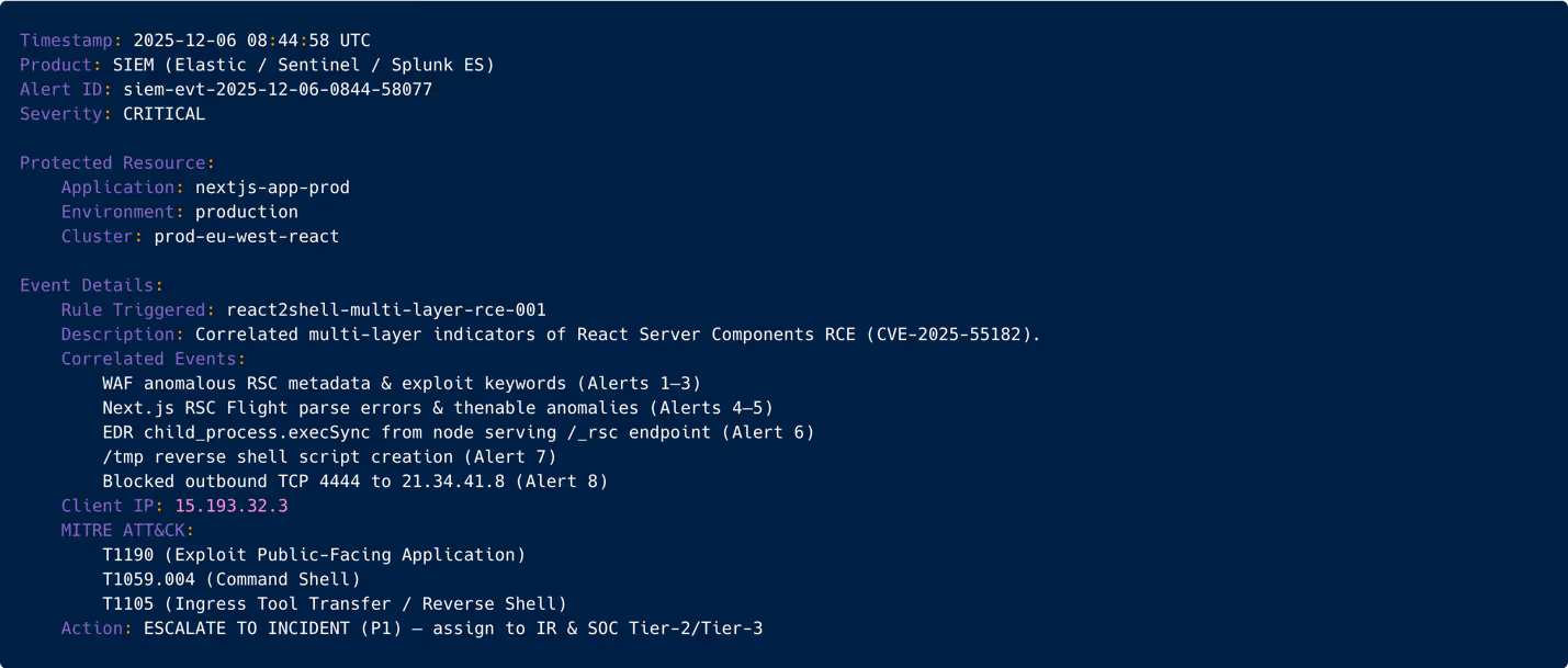 Figure 9: SIEM correlation alert showing full React2Shell exploitation sequence